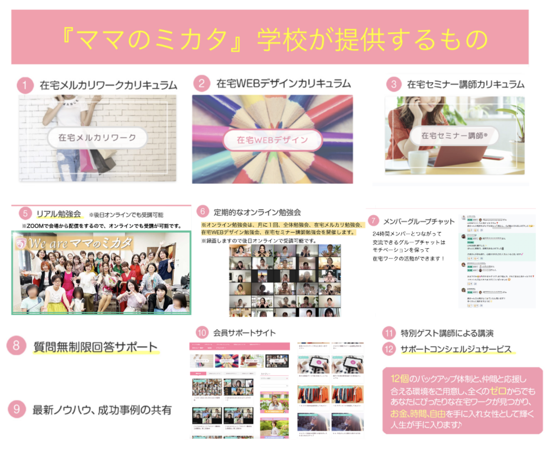 - 学べる分野:メルカリ・WEBデザイン・在宅セミナー講師・ライティング・AIなど。