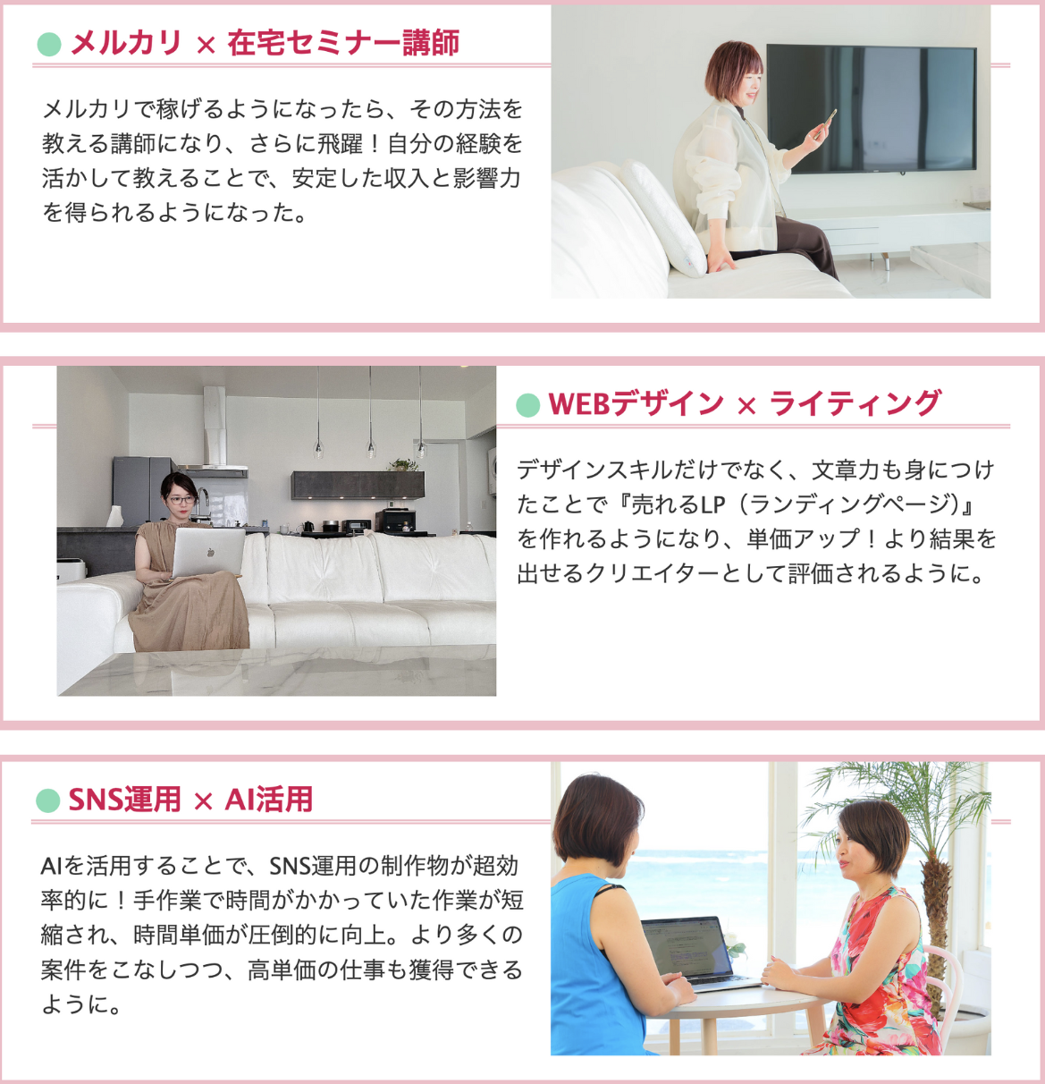 メルカリの物販、WEBデザイン制作、在宅セミナー講師…2〜3本をバランスよく回すことで、季節や家事の波にも負けない、自分だけの安定した収入体制を作れます。