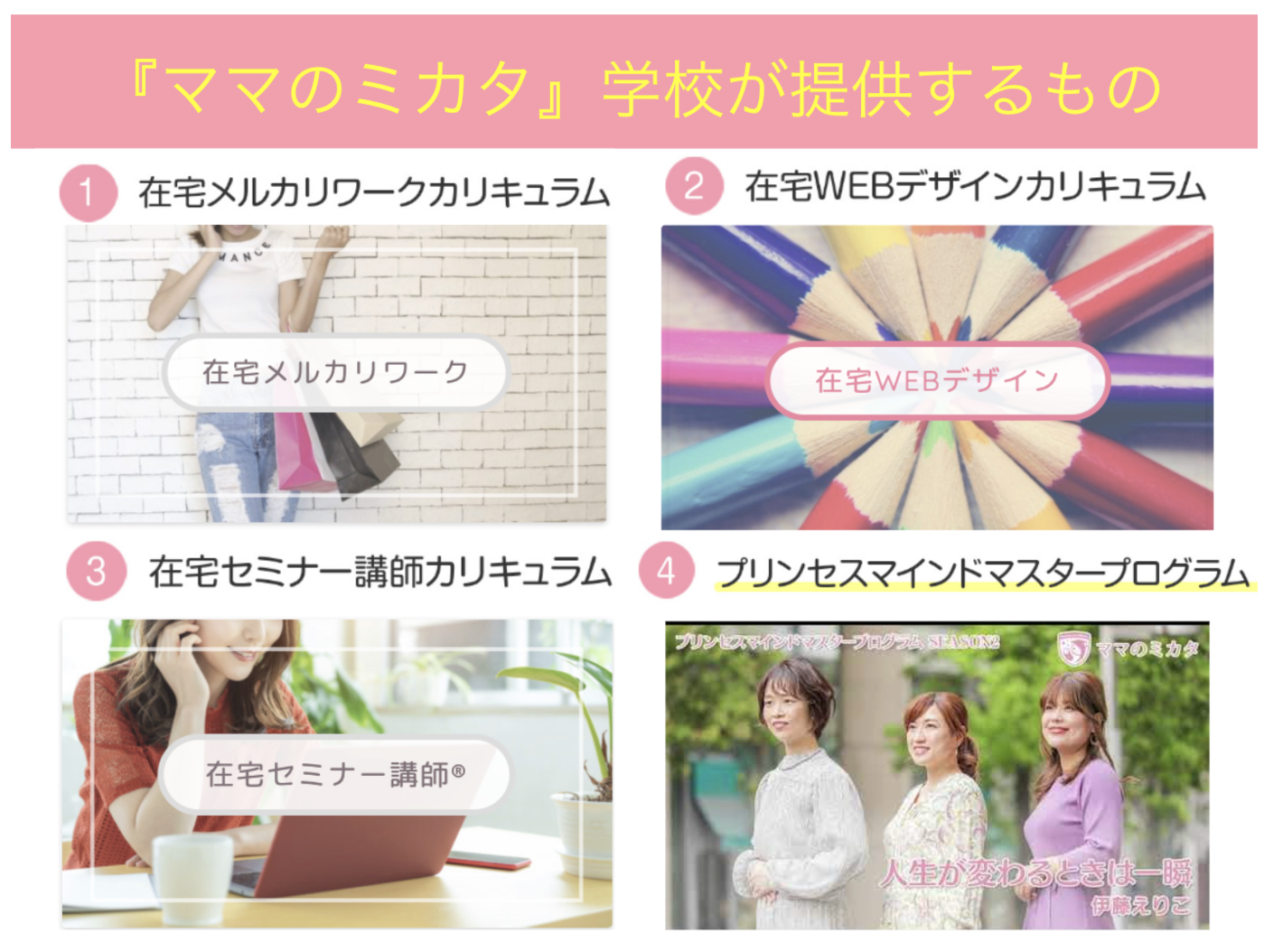 ママのミカタ学校では、学べる内容も広く、メルカリ・WEBデザイン・在宅セミナー講師に加えて、ライティングやAI活用まで揃っています。